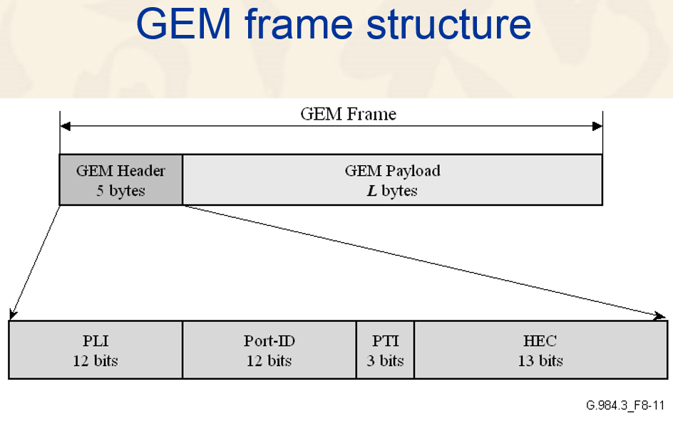 PCBd contains sync, OAM, DBA info, etc. payload may have ATM and GEM partitions (either one or both);