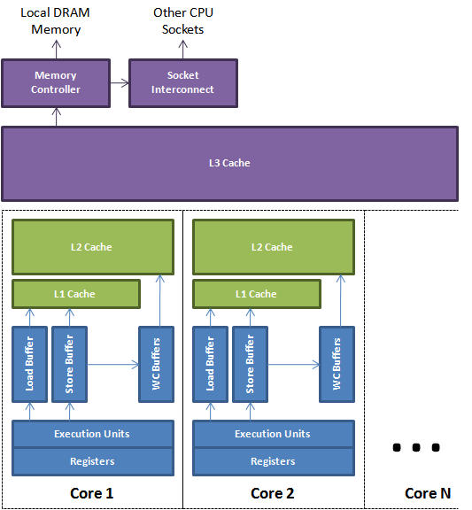 Loads and stores to the caches and main memory are buffered and re-ordered using the load, store, and write-combining buffers. These buffers are associative queues that allow fast lookup. This lookup is necessary when a later load needs to read the value of a previous store that has not yet reached the cache. Figure 1 above depicts a simplified view of a modern multi-core CPU. It shows how the execution units can use the local registers and buffers to manage memory while it is being transferred back and forth from the cache sub-system.